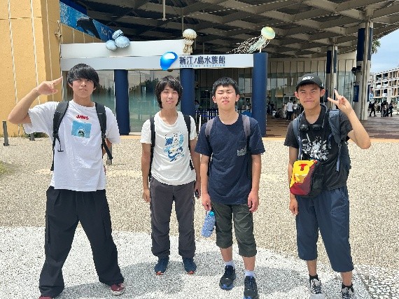 ![]() 片瀬江ノ島駅で集合写真 | ![]() 新江ノ島水族館で集合写真 |